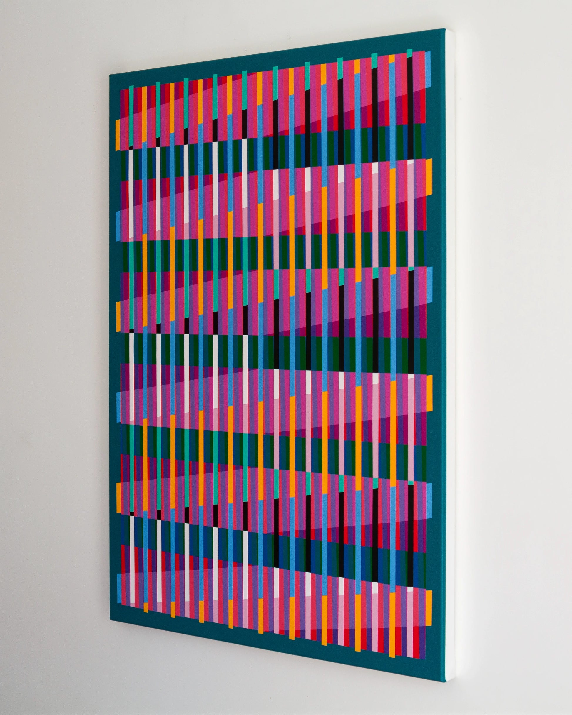 Stripes of bold colour twist and morph across the canvas, producing dynamic, almost optical effects. Joyful, curious, and upbeat, these works are rich in movement and light, offering a bold presence for contemporary interiors. While each painting stands powerfully alone, they form a compelling conversation as a trio.